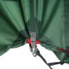 Все узлы, испытывающие повышенные нагрузки, усилены высокопрочной тканью. Край внешнего тента и край юбки обшиты прочной стропой, что значительно уменьшает риск порвать тент ветками и камнями. Стропа красного цвета, поэтому крайпалатки виден даже в сумерках и густой траве. Юбка по периметру палатки защищает от потоков холодного воздуха, дождя и насекомых.